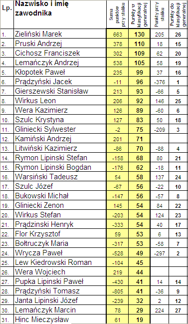 W klasyfikacji generalnej z II miejsca na VI spadł Jacek Prądzyński z Lipnicy. Lider Marek Zieliński z Osusznicy powiększył przewagę nad pozostałymi zawodnikami i ma w posiadaniu 130 pkt. II miejsce zajmuje obecnie Andrzej Pruski z Kiedrowic - 110 pkt., III zawodnik Franciszek Cichosz z Łąckiego Młyna - 109 pkt.