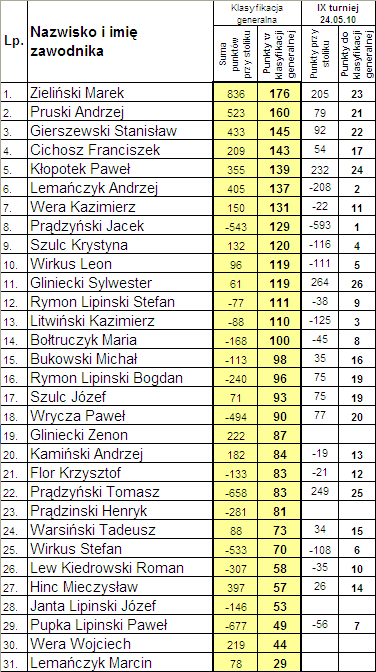 Pierwsze miejsca wywalczyli: Sylwester Gliniecki z Miastka - 264 pkt. przy stoliku, Tomasz PrÄ…dzyÅ„ski z Lipnicy - 249 pkt., PaweÅ‚ KÅ‚opotek z Kramarzyn - 232 pkt. Klasyfikacja generalna w czoÅ‚ówce przed ostatnim turniejem przedstawia siÄ™ nastÄ™pujÄ…co: I miejsce Marek ZieliÅ„ski z Osusznicy - 176 pkt., II miejsce Andrzej Pruski z Kiedrowic - 160 pkt., III miejsce StanisÅ‚aw Gierszewski z Lipnicy - 145 pkt. Jeszcze wszystko może siÄ™ zmienić po uzyskaniu wyników z ostatniego turnieju.