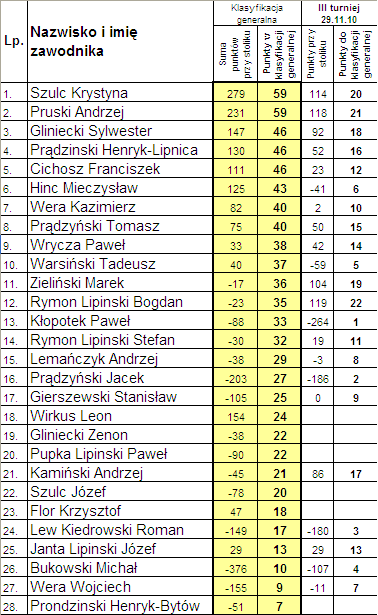 W klasyfikacji generalnej w czoÅ‚ówce nie zaszÅ‚y wiÄ™ksze zmiany. Kolejne miejsca zajmujÄ…: Krystyna Szulc z 59 pkt oraz Andrzej Pruski z 59 pkt., oboje z Kiedrowic. Trzecie miejsce zajmuje Sylwester Gliniecki z Miastka z 46 pkt.