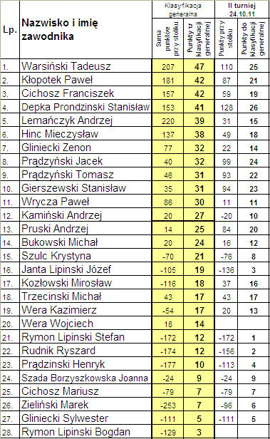 Pierwsze trzy miejsca kolejno zajęli Stanisław Depka Prondzinski z Kiedrowic - 128 pkt przy stoliku, Tadeusz Warsiński z Kramarzyn - 110 pkt, Jacek Prądzyński z Lipnicy - 99 pkt. Na czele klasyfikacji generalnej aktualnie znajduje się Tadeusz Warsiński z Kramarzyn - 47 pkt. Drugą lokatę objął Paweł Kłopotek (również z Kramarzyn) - 42 pkt. Z tą samą liczbą punktów w klasyfikacji generalnej na trzecim miejscu jest Franciszek Cichosz z Łąckiego Młyna (różnica w punktacji przy stoliku).