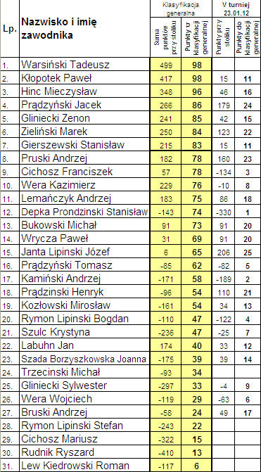 Klasyfikacja generalna po styczniowym turnieju wyglądała następująco: 1. śp. Paweł Kłopotek z Kramarzyn - 99 pkt. (nieodżałowany nasz kolega odszedł jako lider turnieju), 2. Tadeusz Warsiński z Kramarzyn - 98 pkt., 3. Mieczysław Hinc z Lipnicy - 97 pkt.