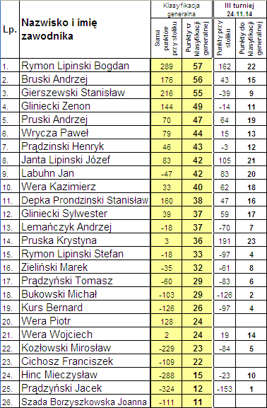 Wyniki rozgrywek w nowej edycji "lipnickiej baśki" z dnia 24 listopada 2014 r.
