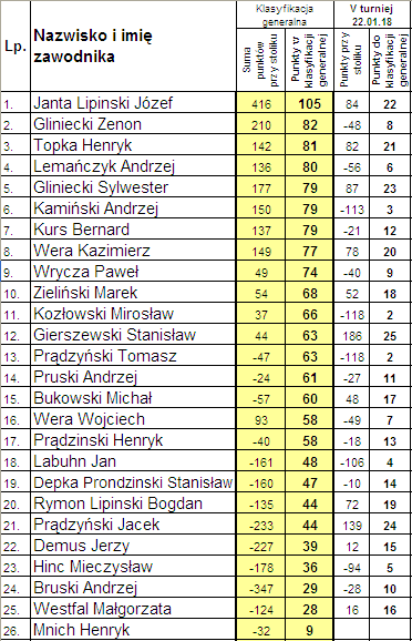 Poniżej klasyfikacja po piątym rozdaniu.